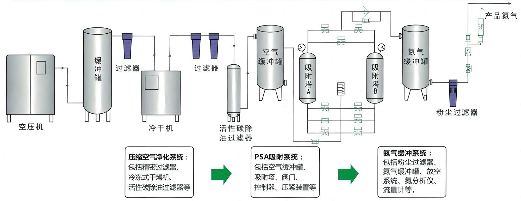 變壓吸附法通常使用兩塔并聯(lián),交替進(jìn)行加壓吸附和解壓再生,從而獲得連續(xù)的氮?dú)饬鳌?